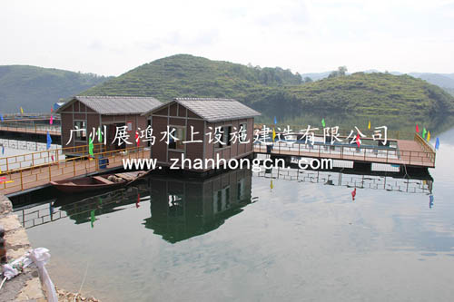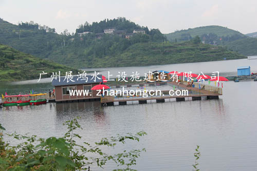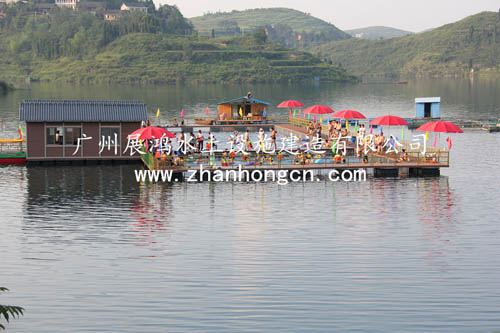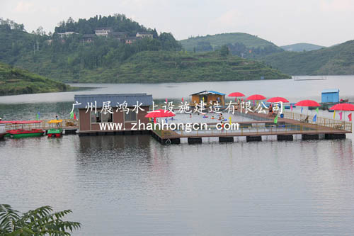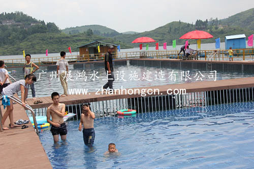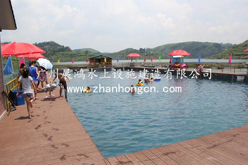 水上漂浮泳池的站水域面積大約1400㎡,四周用欄桿圍住,池底采用浮箱與鋼結(jié)構(gòu)做成,安全穩(wěn)固,表面采用防腐塑木板,看起來高檔。這個(gè)泳池相對(duì)于傳統(tǒng)泳池而言,最大的特點(diǎn)是泳池水直接采用水庫中的水,讓游客們更能親近大自然。這個(gè)水上泳池的過道長為18m,3m寬,兩邊并設(shè)有淋浴間和小賣部,也就是我們圖片上所看到的小木屋,周邊再加上幾艘腳踏船,增加趣味性,池底的水清澈可見。