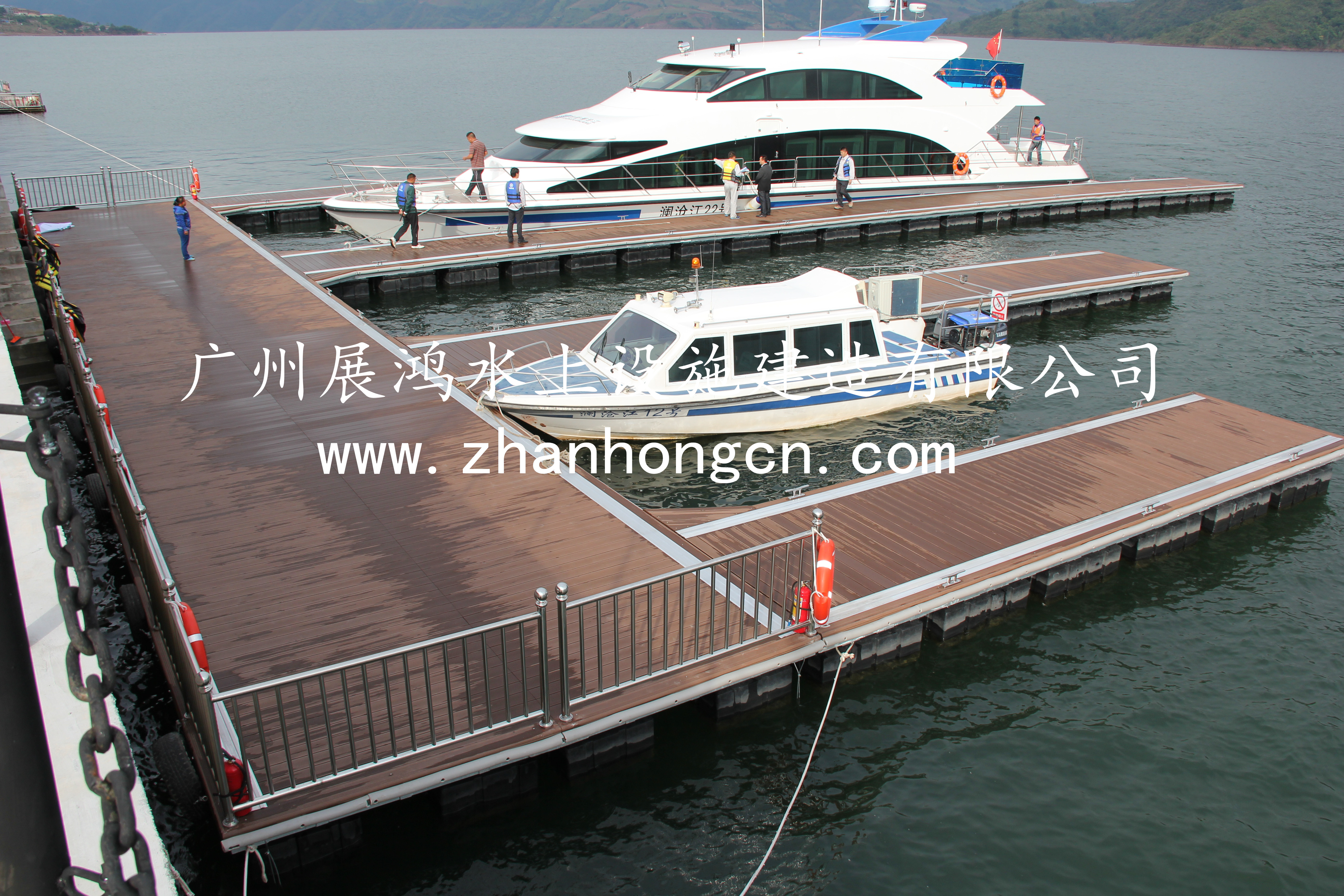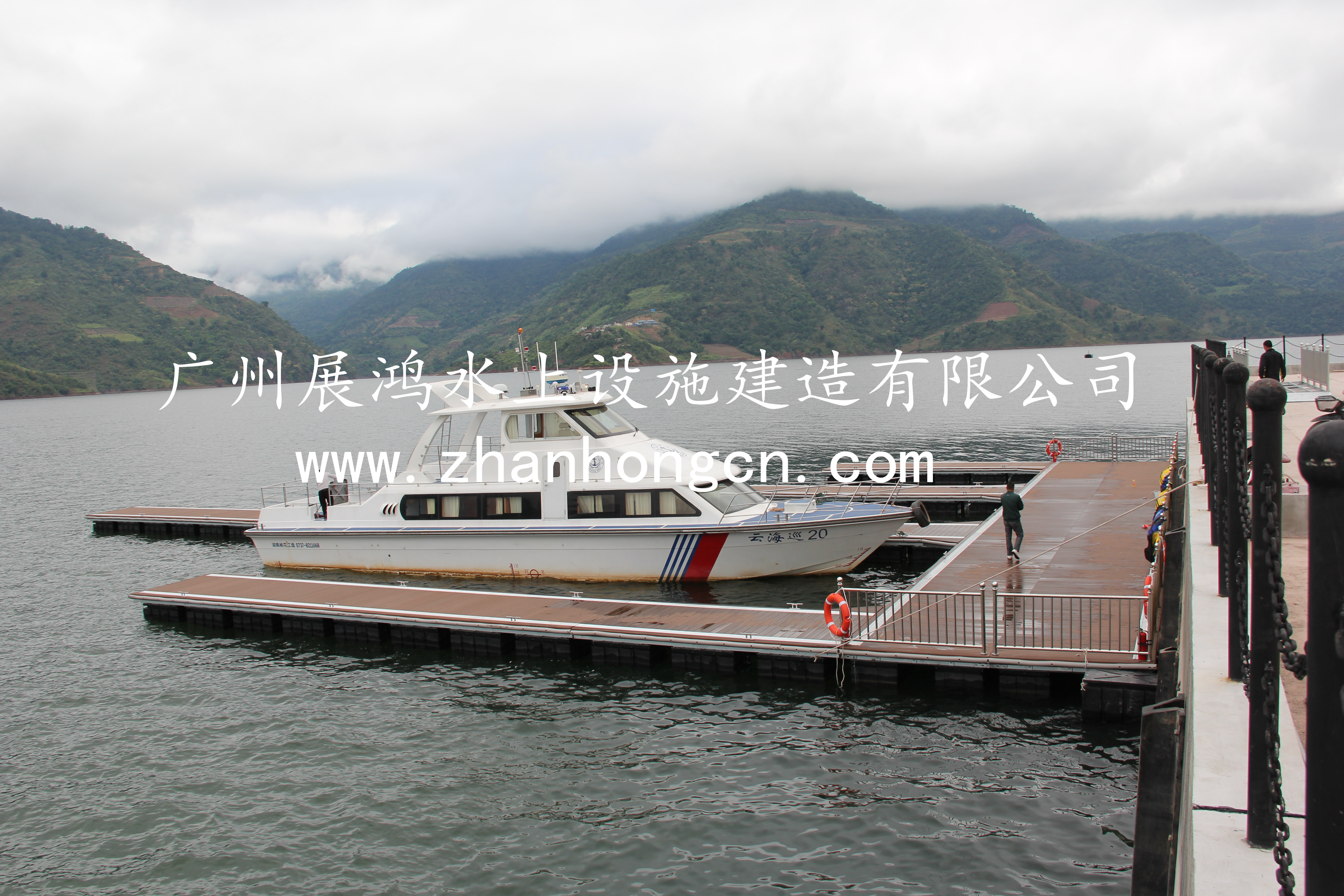 我司充分考慮當(dāng)?shù)貧夂驐l件、庫(kù)區(qū)風(fēng)浪及水位變幅、船只系纜位置分布、現(xiàn)場(chǎng)交通燈特點(diǎn),浮動(dòng)碼頭應(yīng)與船體長(zhǎng)、寬相匹配,外觀大氣、美觀,檔次較高,結(jié)實(shí)耐用,且穩(wěn)定性好,安全性能高。所以浮動(dòng)碼頭與岸坡進(jìn)行連接固定采用鋼絲繩牽引固定或滑軌固定兩種方式,該浮動(dòng)碼頭滿(mǎn)足三艘船只停靠,采用E型布置形式。